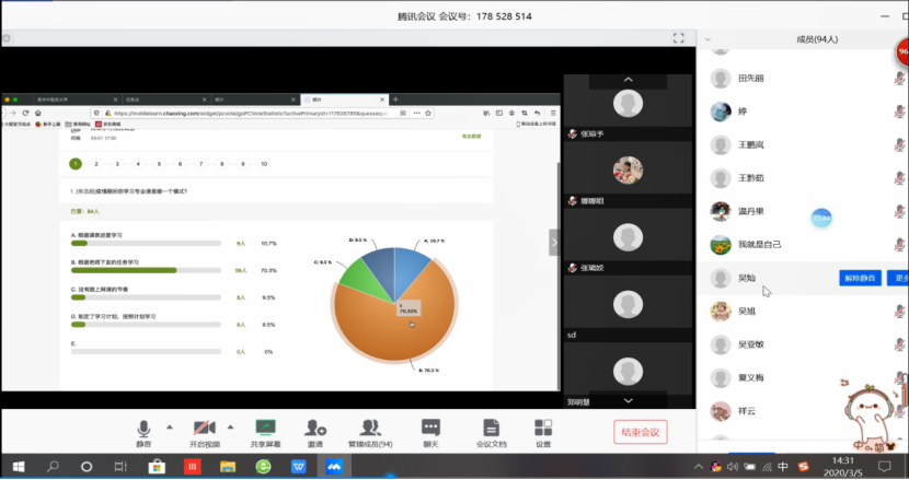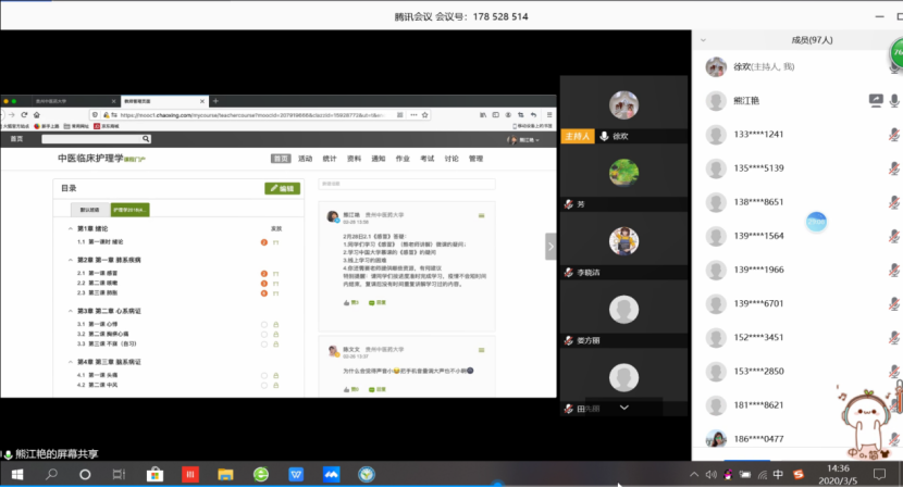 为了广大师生实现疫情防控期间“停课不停学,停课不停教”的教学要求,全面提高我院教师线上教学技能和教学水平,我院于2020年3月5日下午在线开展了“线上教学经验交流分享会”。72886必赢欢迎光临党委书记石国凤教授、副院长肖丽娜教授、各教研室主任和分别来自四个教研室共98名专、兼职教师参加了分享会。